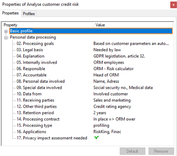 Use Enterprise Studio’s metamodeller to extend your current metamodel with the attributes mentioned above. We have chosen to add a special profile with the necessary attributes to the ArchiMate® application process concept. Next to that we have created stereotypes for Data objects and Business Actors to distinguish data categories, special data and third parties. After applying the metamodel the profile can look like this: