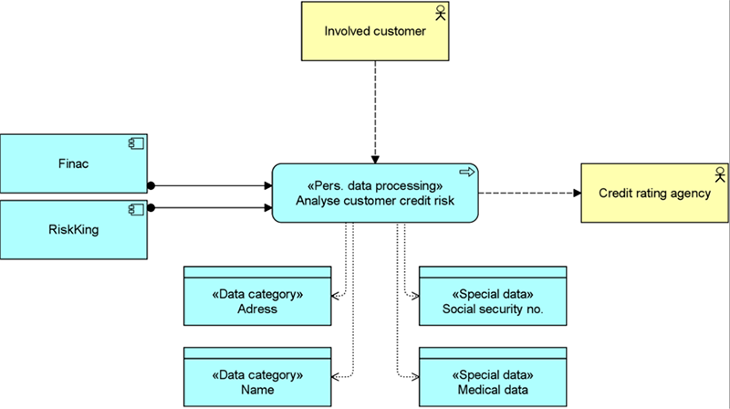 The gathering of all the data on the personal data processing in your enterprise is the hardest part. Maybe you can leverage assessments that have already been done. In the next picture you see an example of a modeled data processing scenario.