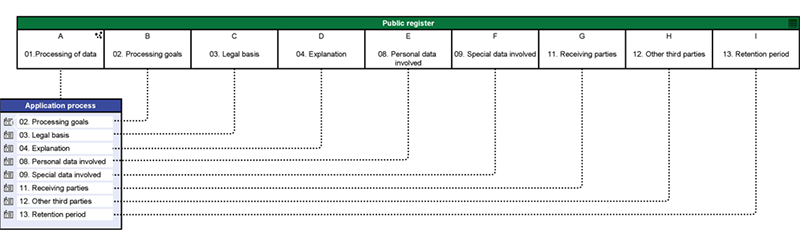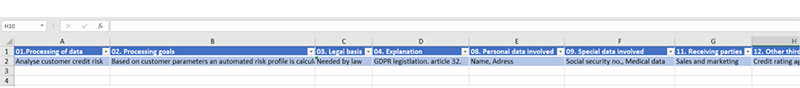 A practical way to implement some of the GDPR requirements is to create a register of all the personal data processing within your enterprise. Such a register could be as easy as a spreadsheet file containing all the necessary data. Such a register can contain the following items e.g.: